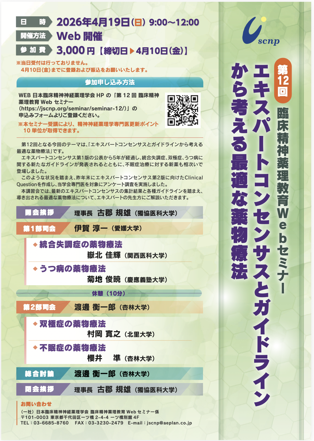 ※本セミナー受講により精神神経薬理学専門医更新ポイント10単位が取得できます。